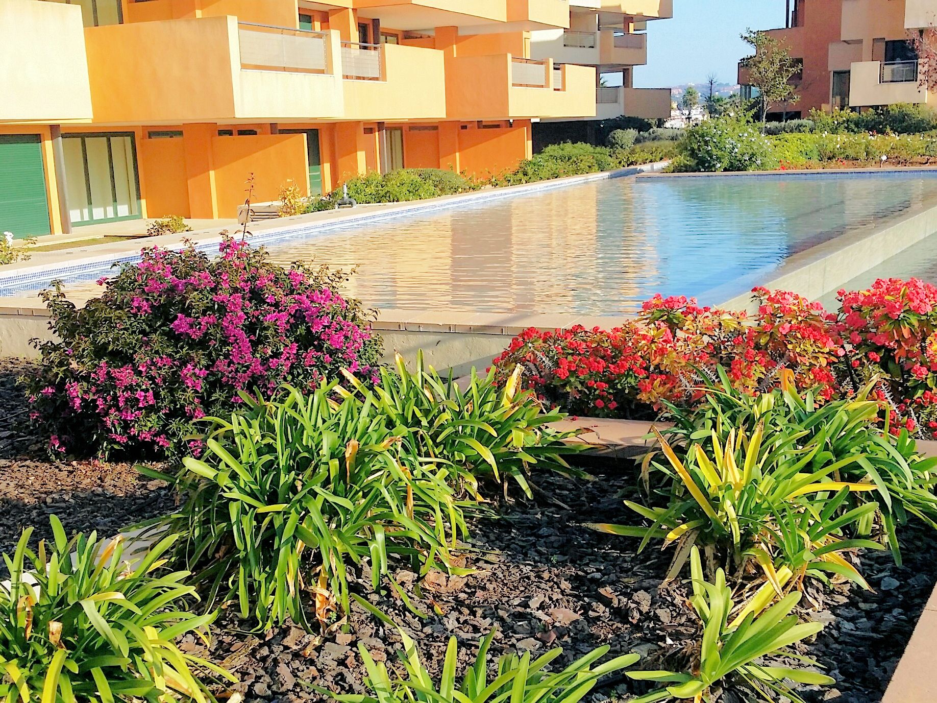 Gated community with 24-hour security, pools, spa, gym, and direct access to shops and restaurants.