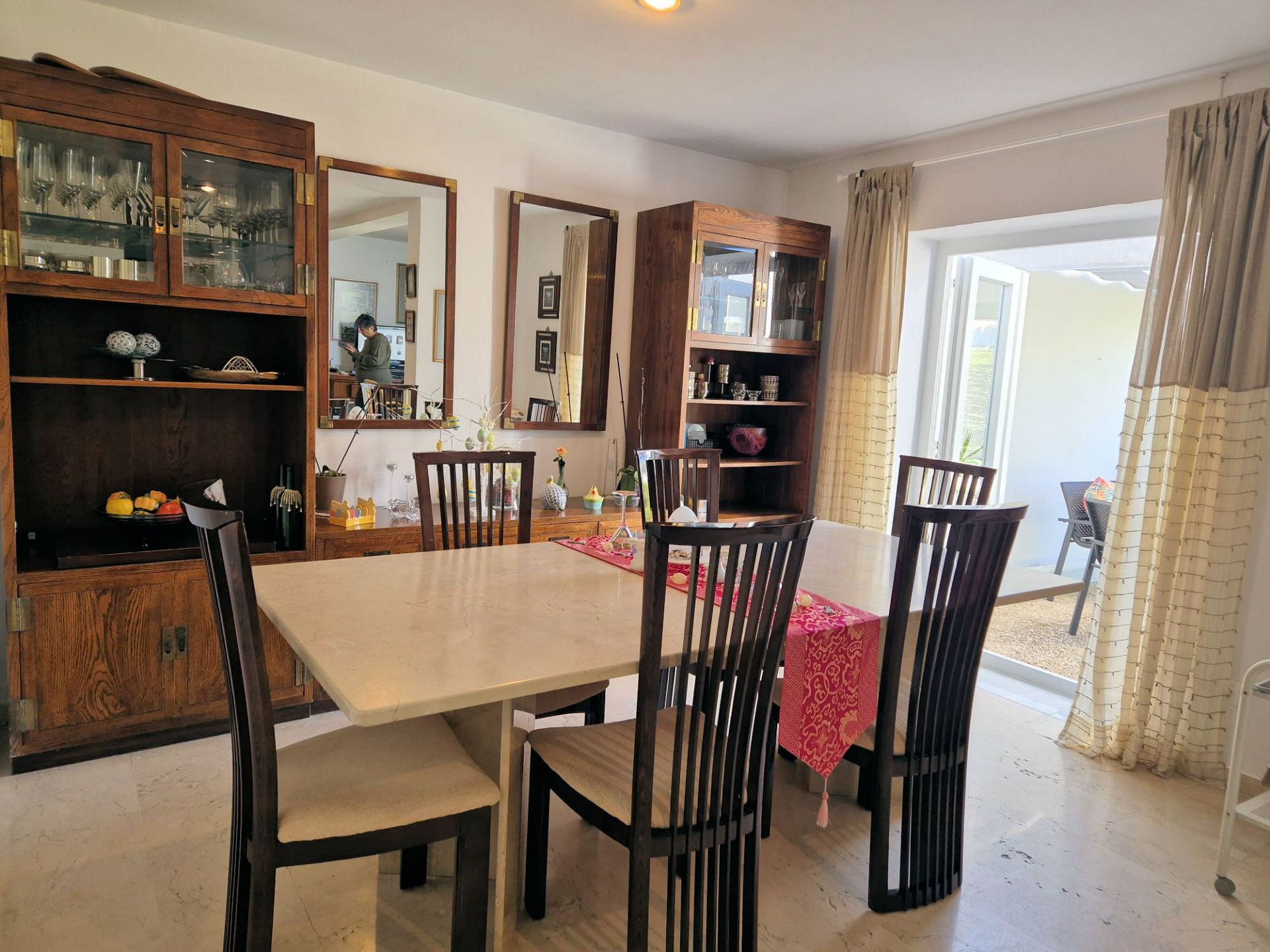 The living room is light and cosy very well kept dining room sits 8 people with beautiful paintings from India.