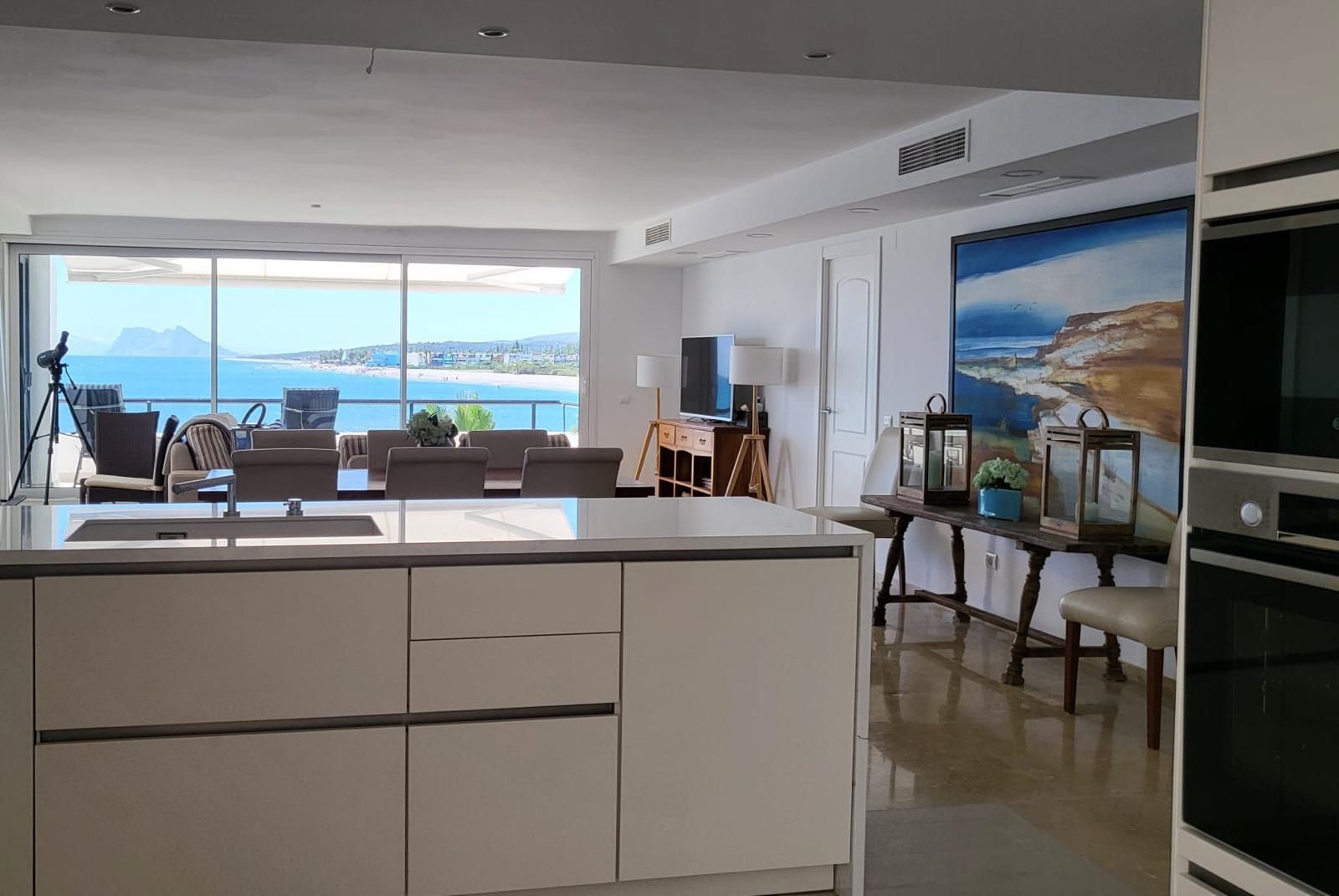 This is a completely renovated apartment with magnificent views of the sea, the Guadiaro River, and Gibraltar on the River Walk, next to the Beach Club El Octógono. The 4 bedrooms are renovated, with 2 at the front of the apartment featuring an en-suite bathroom and shower, and 2 bedrooms overlooking the beach club at the back, with 2 additional bathrooms, one with a shower and the other with a bathtub. Renovated living room and Open-concept kitchen with majestic panoramic views.