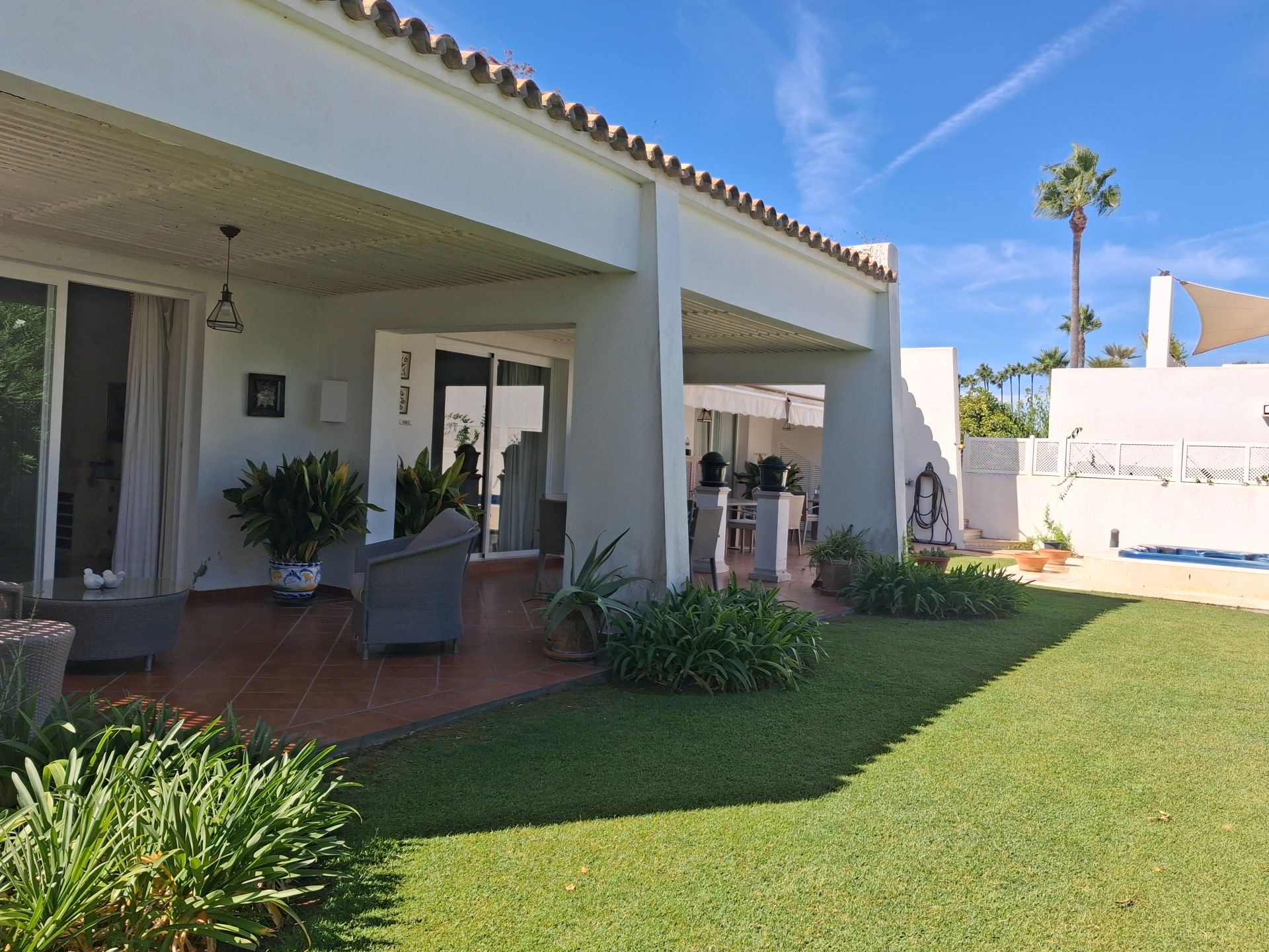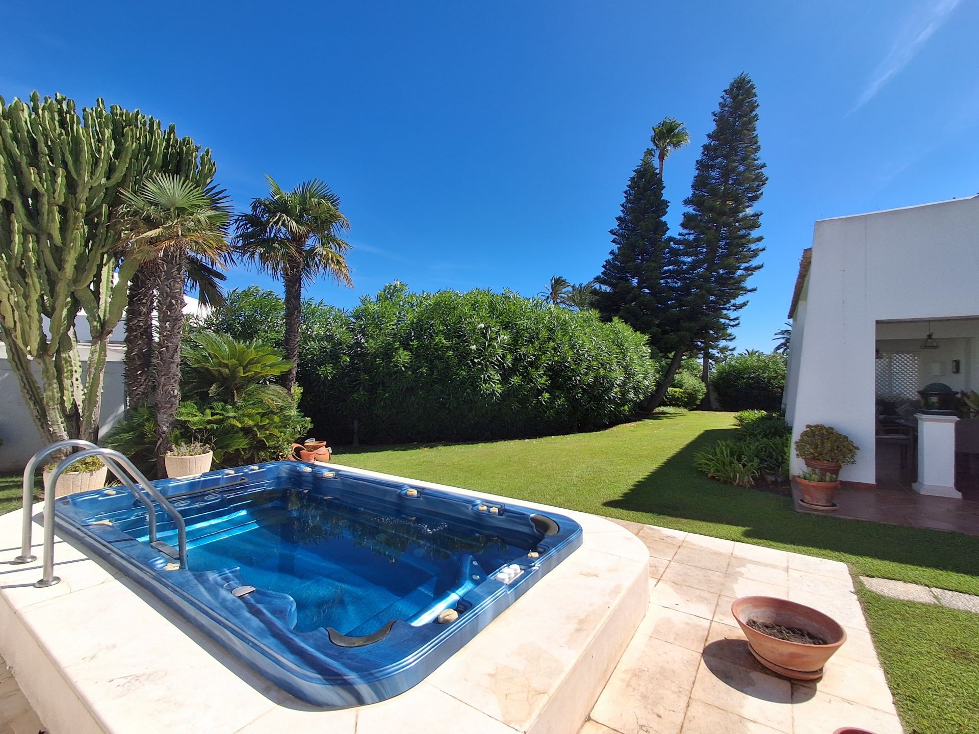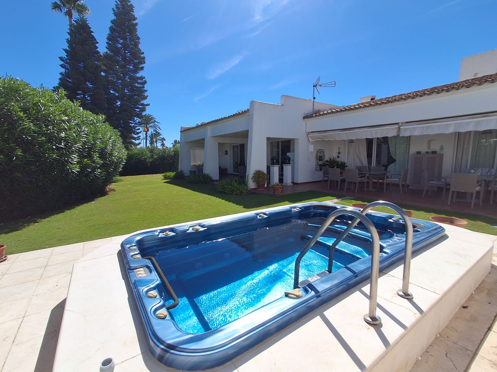This is a well-situated property in the heart of Lower Royal Golf course of Sotogrande, is a very sought after location just across the Beach Clubs of Trocadero including Trocadero´s children Beach club and the Tennis club. The bungalow has 5 bedrooms and 4 bathrooms, a 2 cozy living room which opens to a spacious private garden with very large and unusual Jacuzzi. There is a large roof terrace with Sea views for sitting areas. The kitchen long and is fully equipped, and 4 private carports. It is a minute away from the beach and the restaurants and amenities.