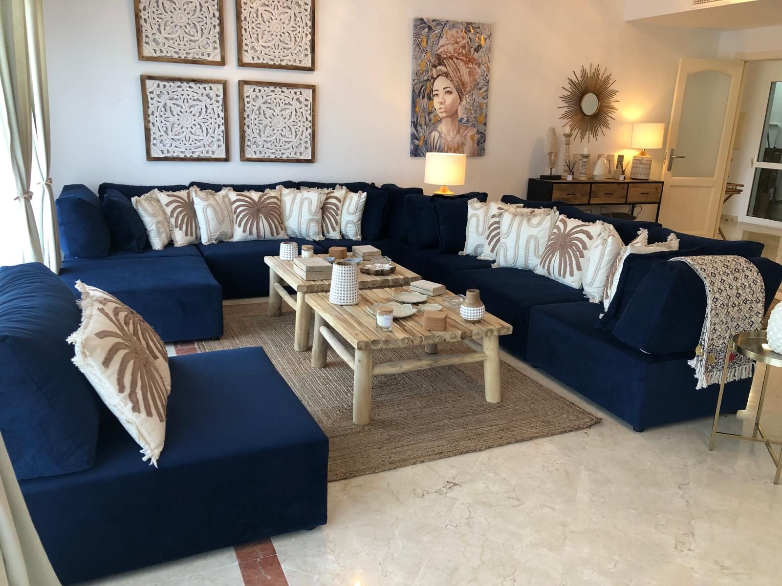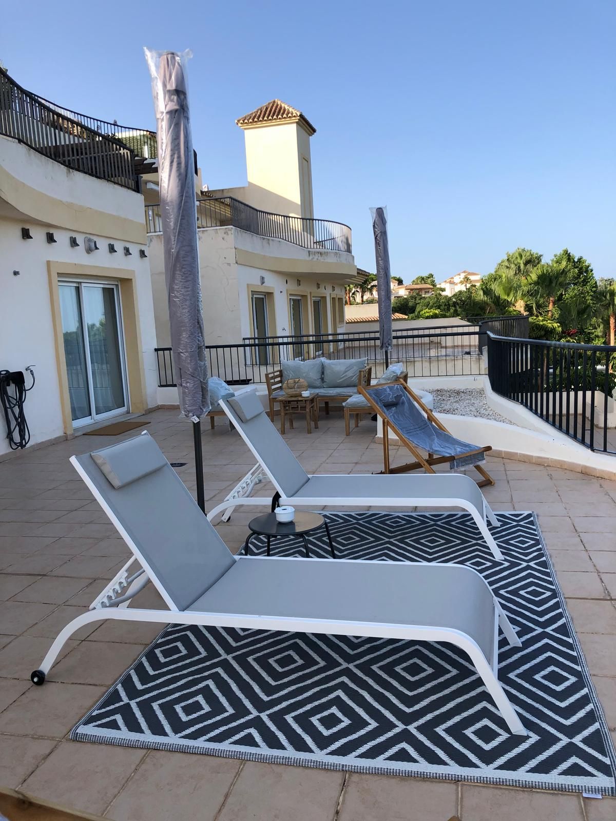 The living room opens onto a large furnished terrace.