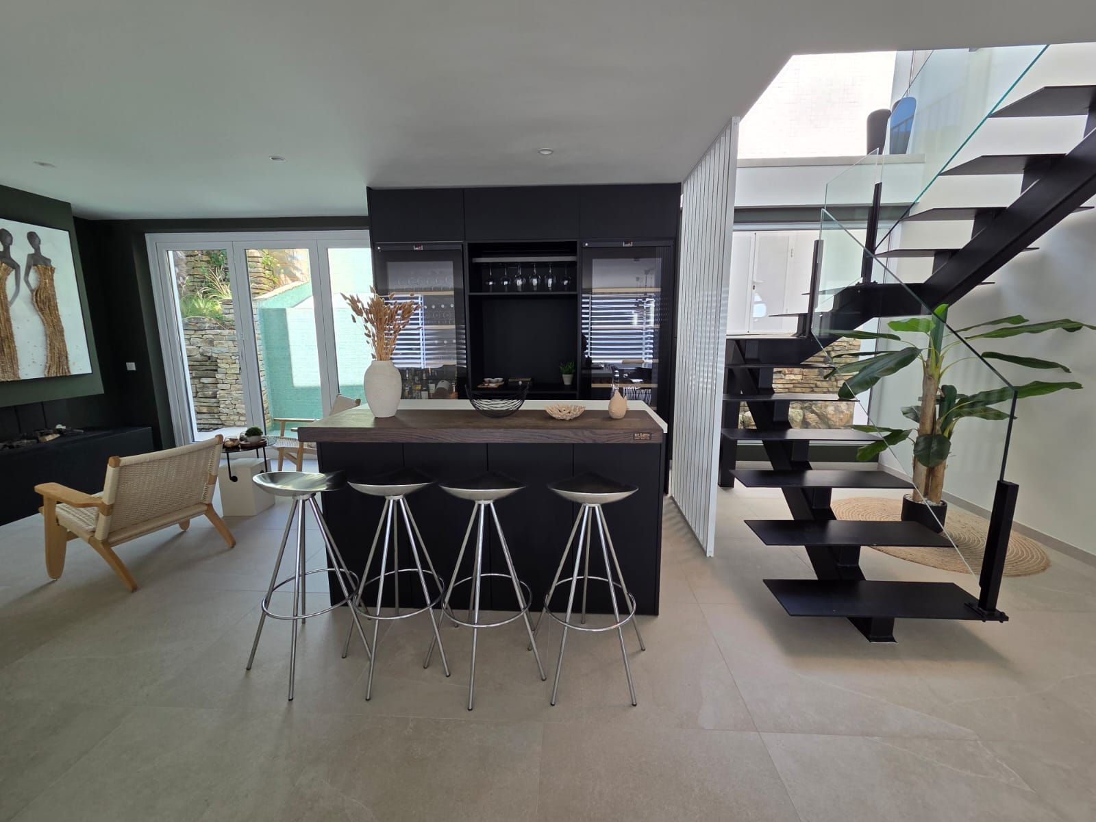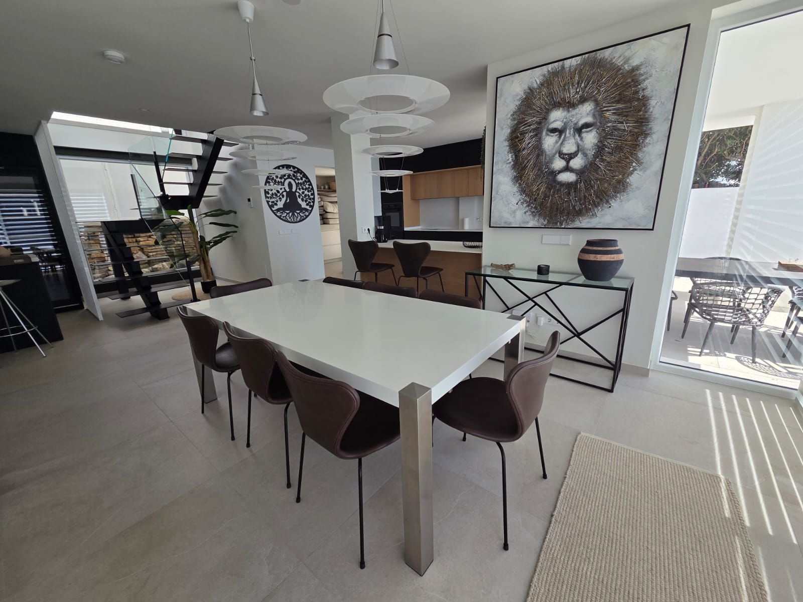 There’s a large living room with comfortable sofas and an interesting bar, dining room all under high ceiling.
